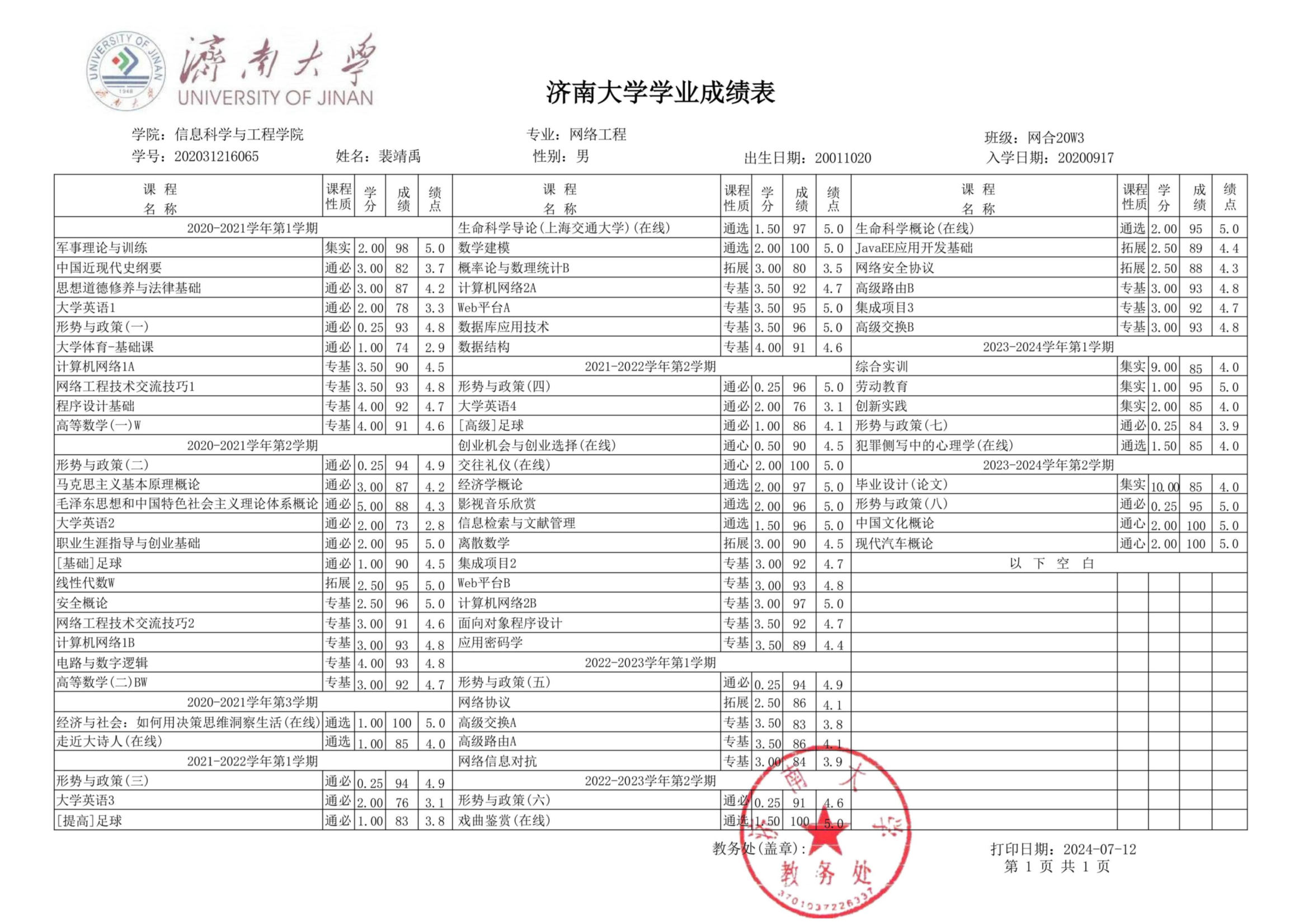 2020-2021年第1学期: